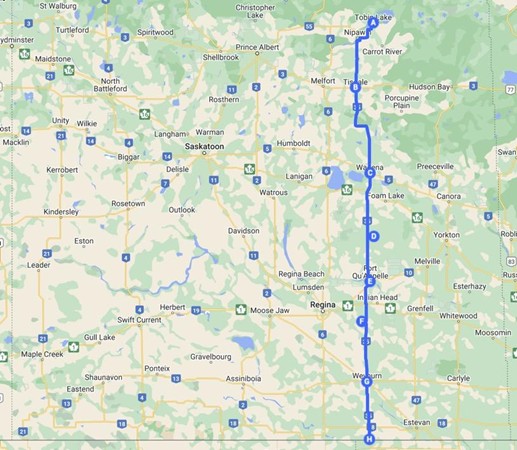 GASP 2025 will be exploring a cross-section of the prairie landscape – starting in the Boreal Forest and travelling southbound to the southern border. Departing Tobin Lake and encompassing about 600 km of cycling until the tour reaches Saskatchewan’s southern border at the Port of Oungre. Along the way there will be opportunities to explore the great communities and parks.  The tentative tour route is shown and described below however it is subject to change as tour logistics are established.